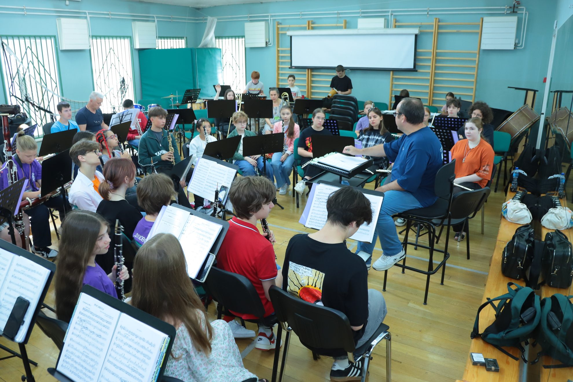 7 августа стартовали репетиции сводного духового оркестра Летней школы в Гнесинке. Молодые таланты собрались со всех уголков России, чтобы отточить мастерство игры в коллективе. Юным музыкантам помогают профессионалы — солисты ведущих оркестров нашей страны. Старшие товарищи будут поддерживать их не только на репетициях, но и во время отчетного концерта, который пройдет на Летней сцене 12 августа.